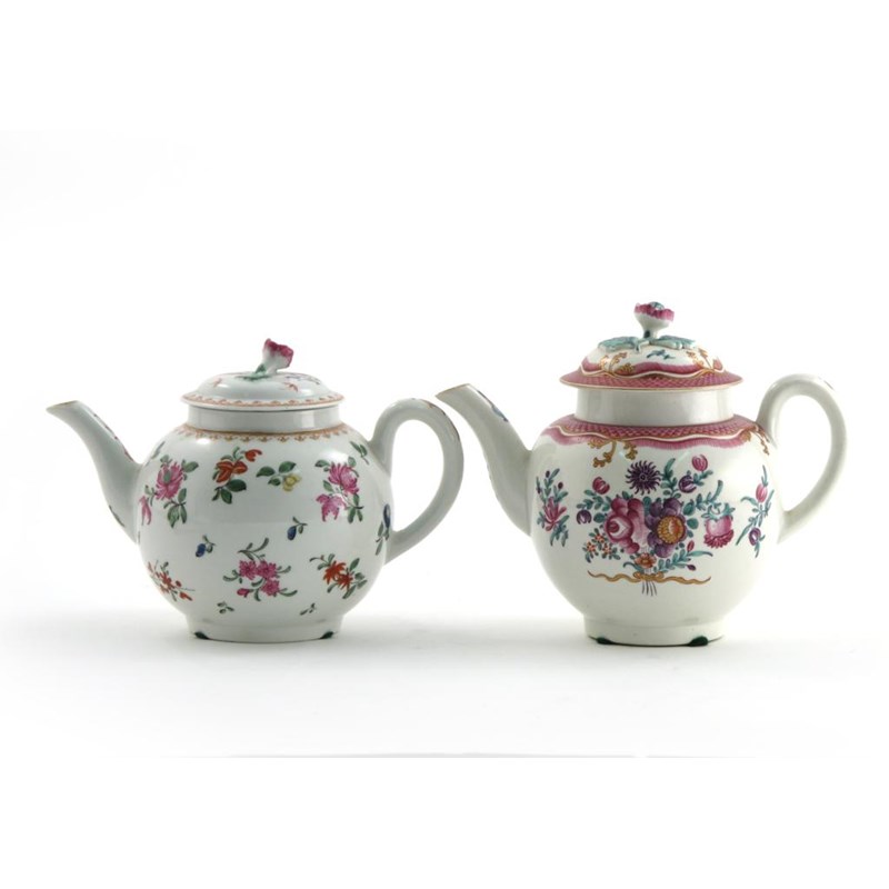 Two English porcelain teapots and covers 2nd half 18th century, painted with polychrome flowers, one with a pink scale border, the covers with floral finials, restoration around one handle, 19cm. (4)