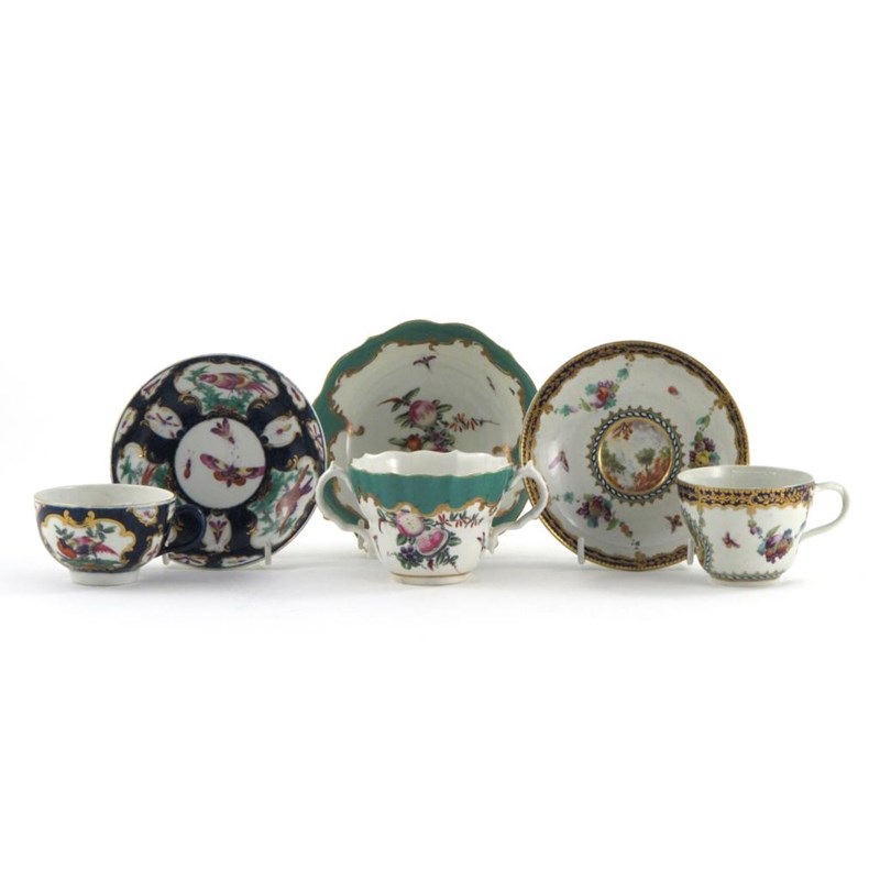 Three Worcester cups and saucers 2nd half 18th century, one reserved with panels of birds on a blue scale ground, another painted in the Dalhousie fashion with landscape panels between fruit garlands, and another later-decorated with fruit and green borders, 14.5cm max. (6)