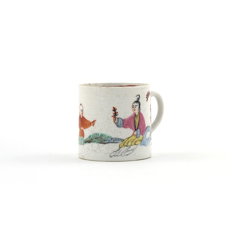 A small Bow mug c.1765, painted with Chinese figures seated in a garden with holey rockwork, the interior with an iron red border, 5.6cm high.