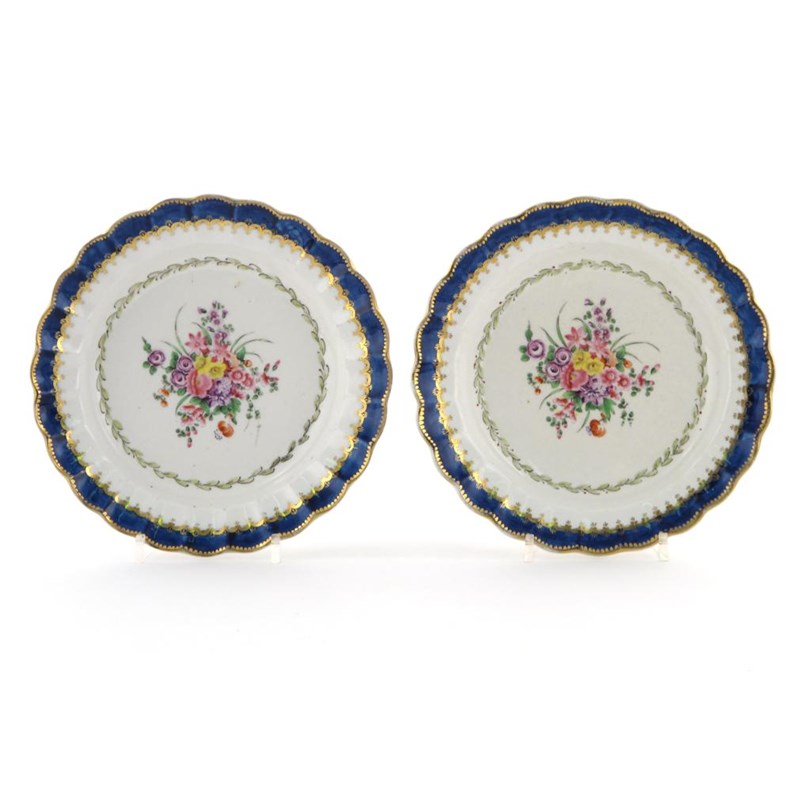 A pair of Worcester dessert plates c.1770-80, the wells painted with radiating floral arrangements within berried laurel borders, the rims with a band of blue between gilt dentil and foliate borders, 21.2cm.
