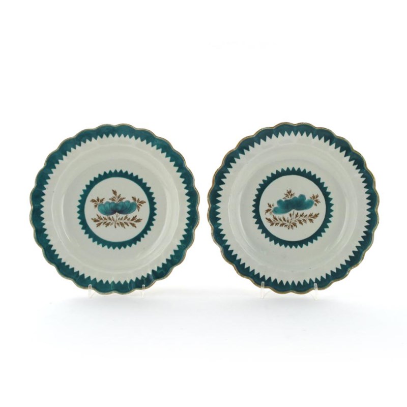 A pair of Worcester scallop-edged plates c.1775-80, decorated with single flower stems within jagged borders of French green enamel, 21.5cm. (2)