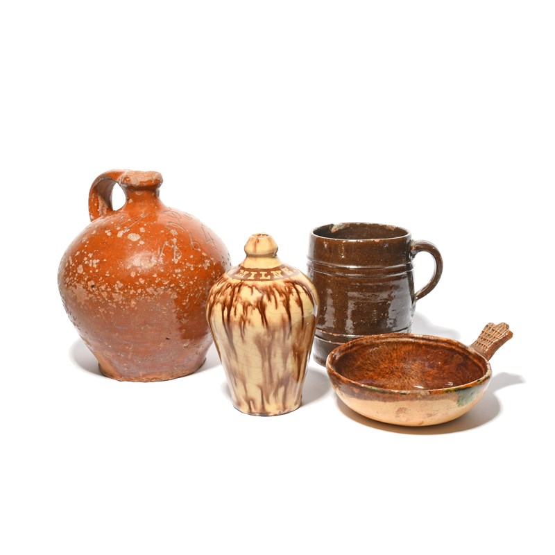Two slipware flagons, 19th century, one Sussex and decorated in a treacle glaze, inscribed 'A Quyne 1864', the other Halifax with a striated manganese glaze, titled 'J. Milne', a large Wiltshire mug of barrel shape, decorated in a black glaze, and a slipware quaich of circular form, decorated in manganese, some faults, 21cm max. (4)