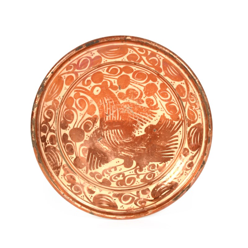 A Hispano Moresque lustre bowl or charger, late 17th/18th century, decorated in copper lustre with a large bird amidst stylised branches, the rim with a repeated foliate motif, three rim cracks, 36cm.
