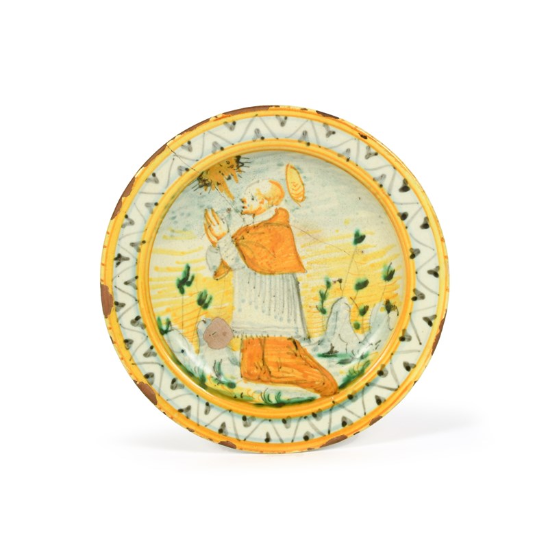 A small Italian maiolica dish or tazza, 18th century, painted with St Francis of Assisi kneeling and