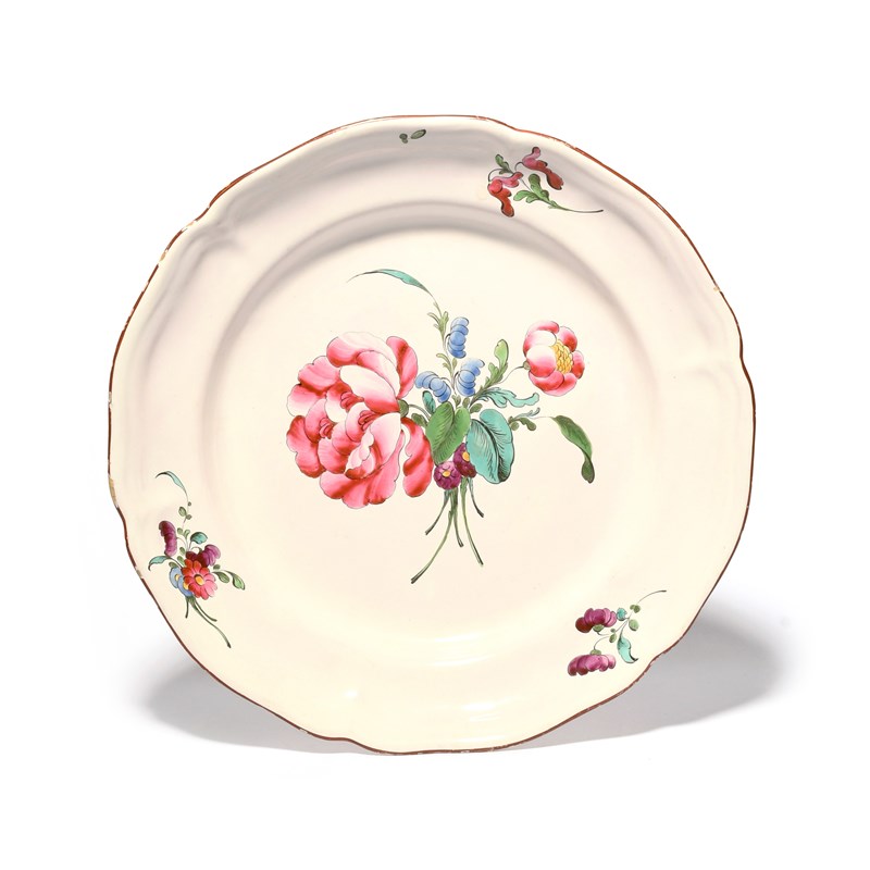 A large French faïence plate or charger, late 18th century, boldly painted with a flower spray, with