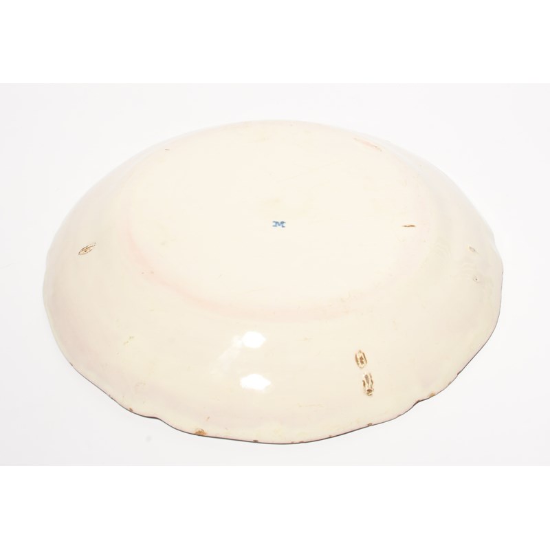 A large French faïence plate or charger, late 18th century, boldly painted with a flower spray, with scattered sprigs to the rim, blue M mark to the base, 32.5cm.