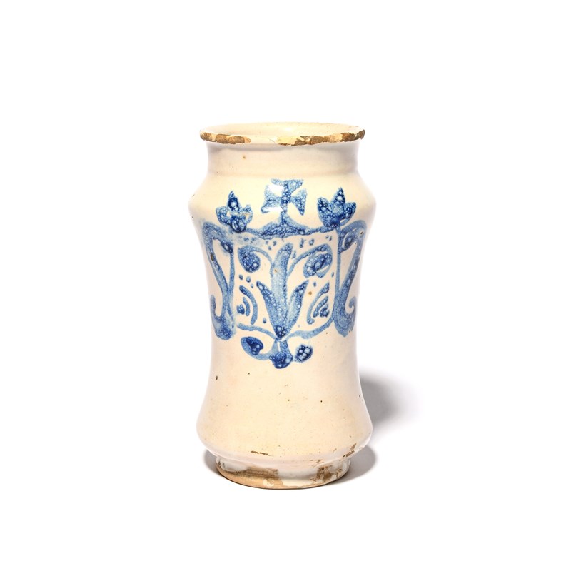 A small Italian maiolica albarello or pill jar, 18th century, the narrow waisted form painted in blue with a shield enclosing a flower stem, surmounted by a cross, a little chipping, 13.2cm.
