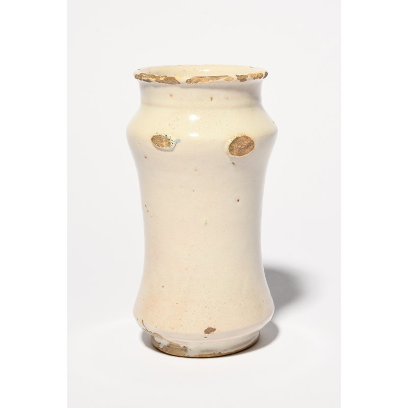 A small Italian maiolica albarello or pill jar, 18th century, the narrow waisted form painted in