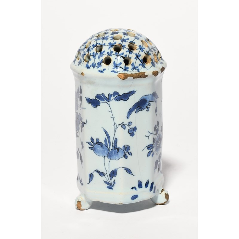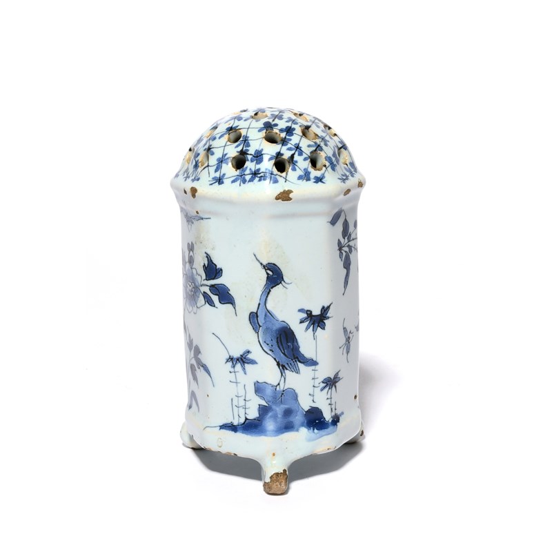 A Delft caster or sugar sifter, 18th century, of octagonal form, painted in blue with birds standing and in flight beside flowering branches, the domed top pierced with small holes, raised on three feet, a little glaze chipping, 12cm.