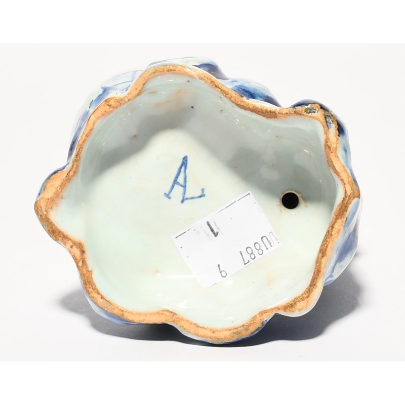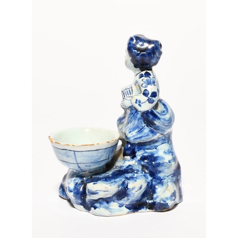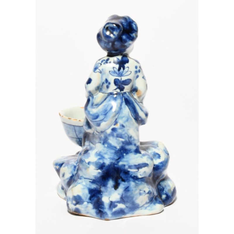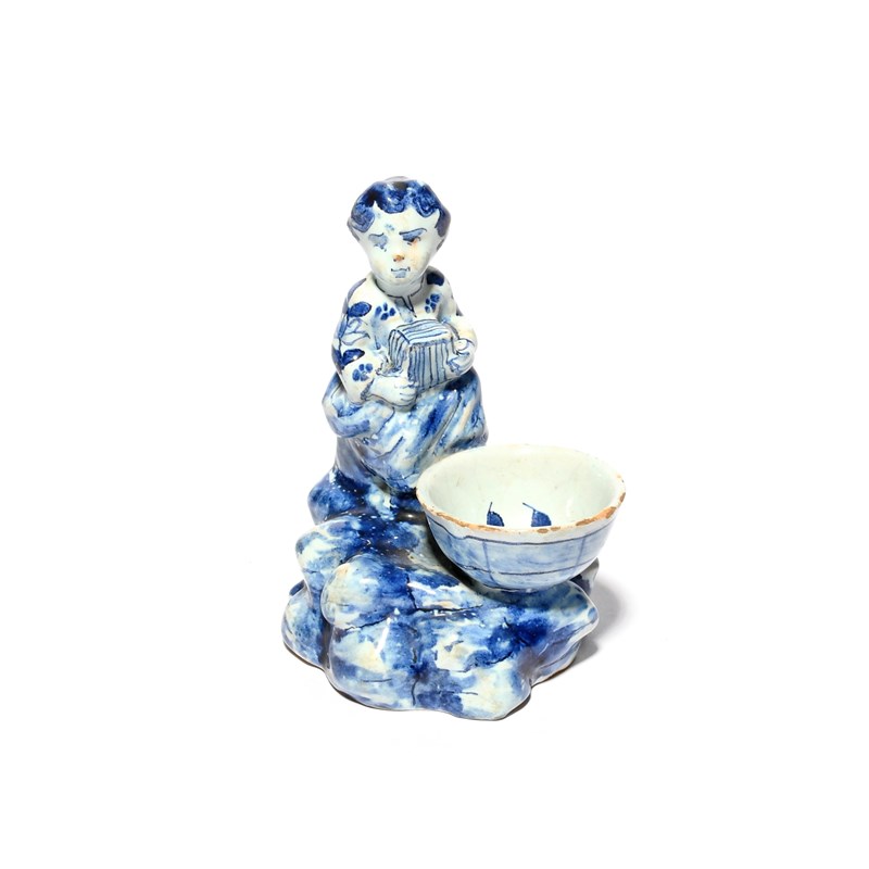 A small Delft figural salt, 18th century, modelled as a girl seated and holding a box or instrument, before a small bowl, all raised on a rocky base, blue AL monogram mark, 10.5cm.