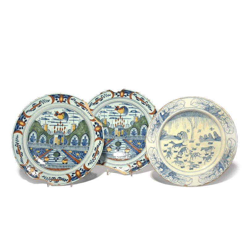 A rare pair of Delft plates, early 18th century, boldly painted in blue, red, green and yellow with a formal Dutch garden landscape showing a narrow canal before spired buildings and a prominent cockerel weather vane, with a rare Liverpool delftware plate painted in blue with the Eight Horses of Mu Wang after a Chinese original, damages and restoration, 29.5cm max. (3)