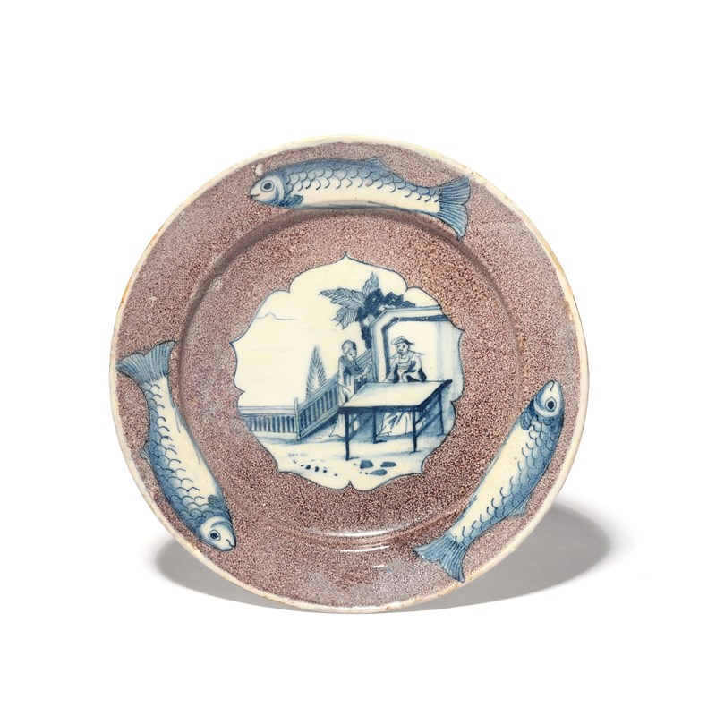 A delftware plate, c.1750, the well finely painted in blue with a Chinese dignitary seated at a table with an attendant beside, the rim with three fish, reserved on a powdered manganese ground, restored, 22.5cm.