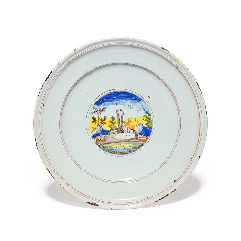 A Continental tin-glazed plate, 18th century, the well painted in polychrome enamels with a roundel of a tower in a landscape, within concentric manganese circles, some glaze chipping to the rim, 24cm.