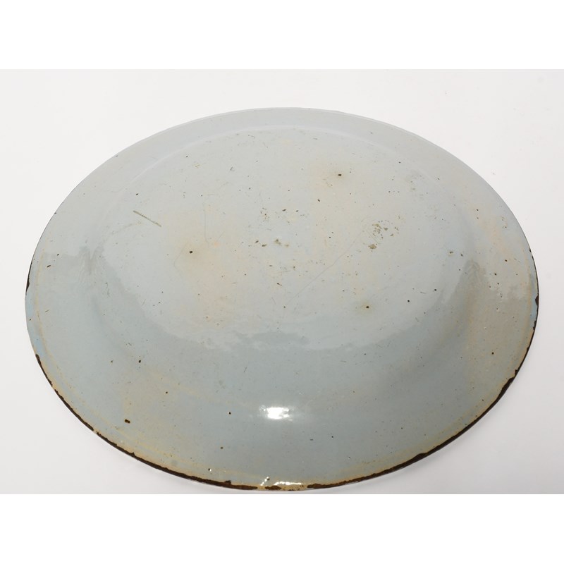 A Continental tin-glazed plate, 18th century, the well painted in polychrome enamels with a roundel