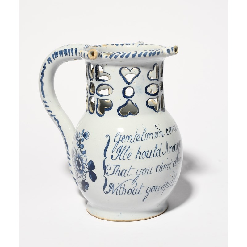 A delftware puzzle jug, c.1760, probably Liverpool, painted with flower sprays flanking a four line verse inviting drinkers to try their luck, the tall neck pierced with hearts and ovals, the rim with three small spouts, some good restoration to one spout, some glaze chipping, 18.5cm high.