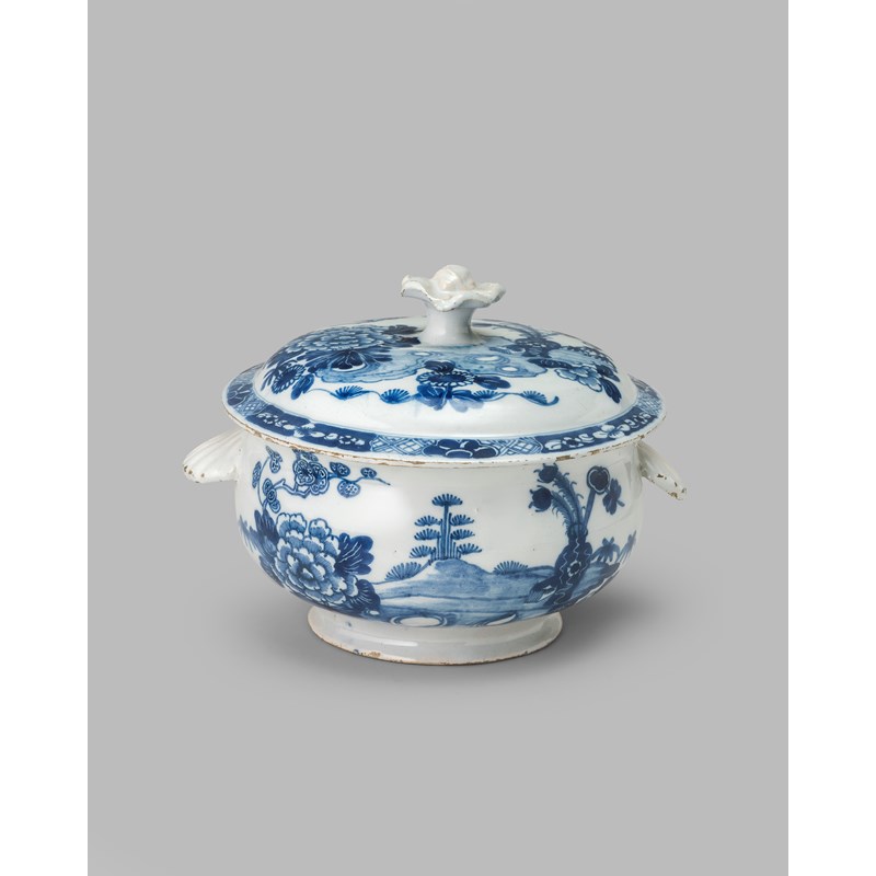 A rare and previously unrecorded Irish delftware tureen and cover, c.1760, the circular form with everted rim, painted in blue with the Feathers in a Vase pattern, a vase of peacock feathers beside flowering branches, the cover's rim with a panelled border, the cover with a floral knop, painted numeral marks, 22cm across. (2)