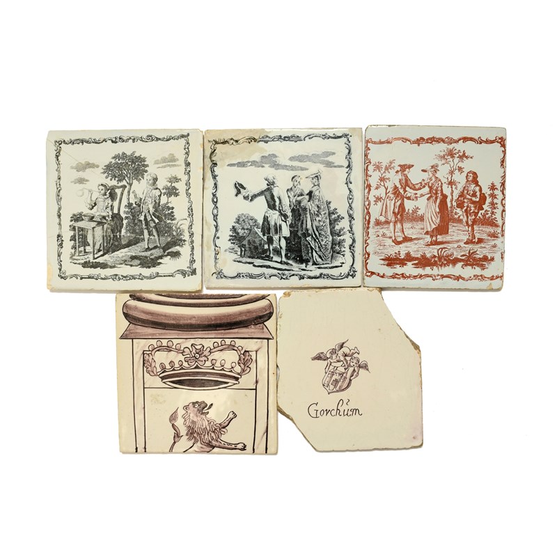Three Liverpool delftware tiles, c.1760-70, printed by John Sadler, one with a girl blowing bubbles in a garden, after John Bowles, another with a gentleman doffing his hat to two ladies (after The Ladies' Amusement), the last with a lass being chucked under the chin, and two Delft tiles painted in manganese, one from a larger panel, the other with an armorial shield for the Dutch town of Gorchum, damages, 12.8cm max. (5)