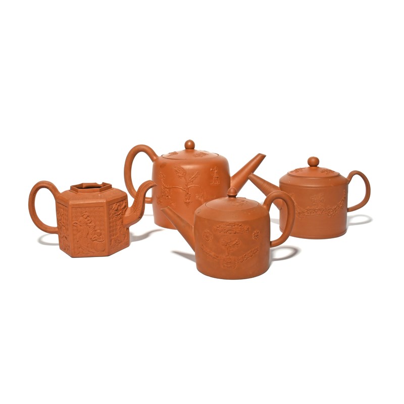 A redware punch pot and cover, mid 18th century, the cylindrical form sprigged with a figure blowing a hunting horn beside formal flowering branches, square seal mark, and two redware teapot and covers, applied with birds flanking a rose bush, the other with formal rose and leaf motifs, impressed seal mark to one, together with a hexagonal teapot moulded with Chinese figures, minor damages, one cover probably associated, another lacking, 26cm max. (7)