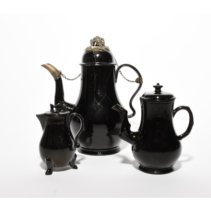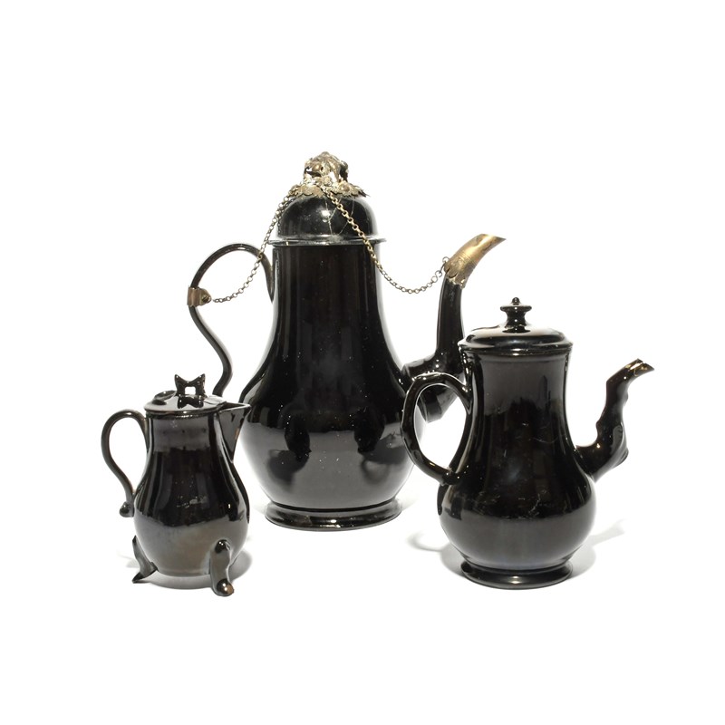 Two Jackfield coffee pots and covers, c.1750, the larger coffee pot with later silver-coloured metal mounts linked by chains, the smaller with a crabstock spout and handle, together with a milk jug and cover, raised on three paw feet, some damages, 27.6cm max. (5)