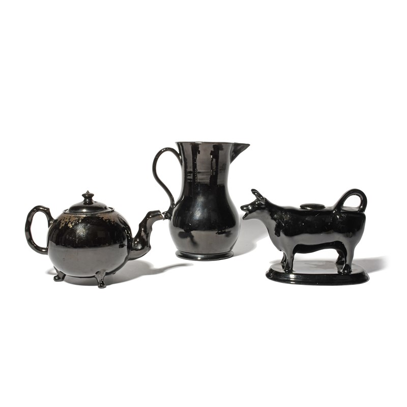 A large Jackfield jug and a teapot and cover, c.1760-80, the teapot with crabstock spout and handle, raised on three paw feet, with traces of gilding to the shoulder, the jug of baluster shape and raised on a low circular foot, with a later black-glazed cow creamer and cover, 19.3cm max. (5)