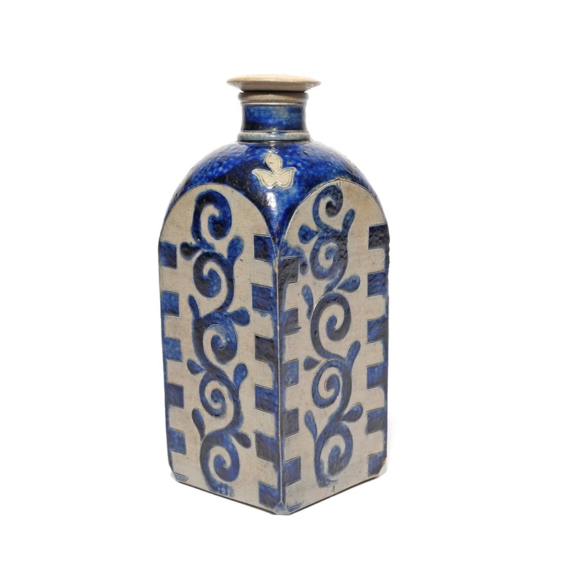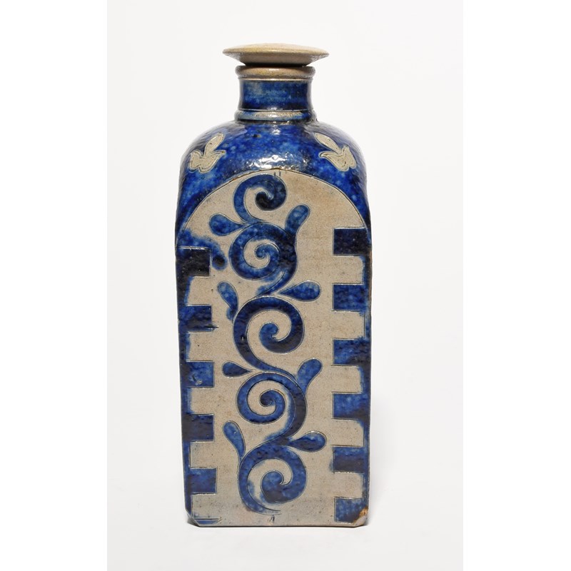 A Westerwald stoneware square flask or bottle and stopper, early 18th century, the four sides each decorated with a scrolling blue design, the rounded shoulders with a grey trefoil motif, the stopper with a screw fitting, chipping to the edge of the stopper, 20.3cm. (2)