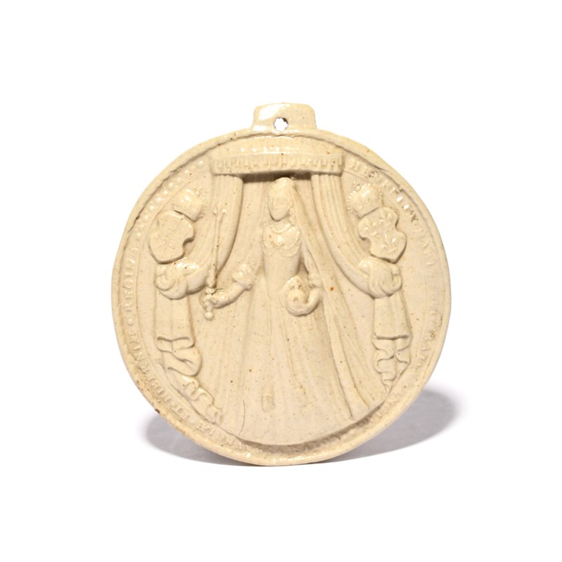 An English salt-glazed stoneware plaque or roundel, early 18th century, probably Fulham, modelled in relief with a full length portrait of Henrietta Maria of France, wife of Charles I, holding an orb and scpetre, pierced with a suspension hole to the top, 9.5cm.