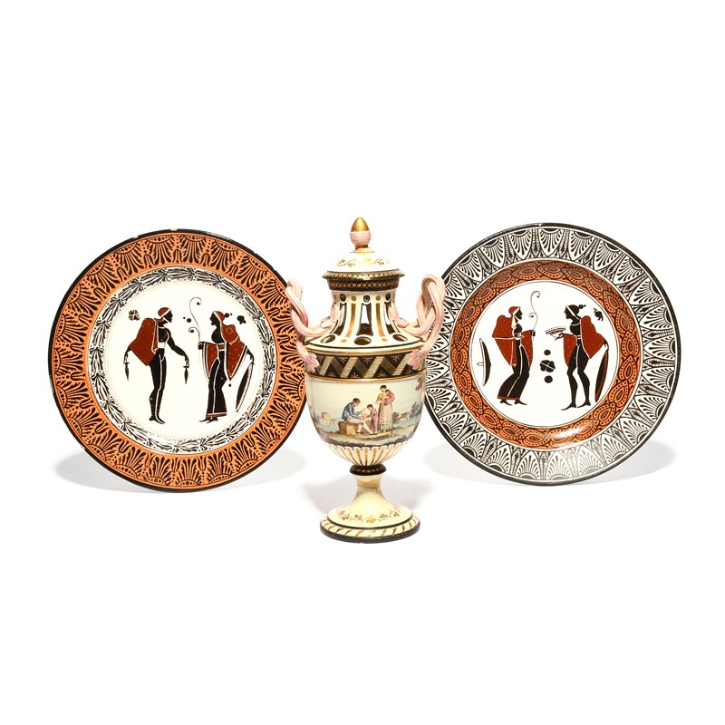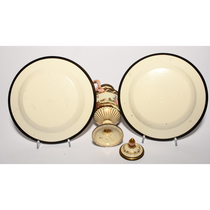 Two Naples (Guistiniani) creamware plates, 19th century, decorated in the Egyptian Revival manner with figures in black and terracotta within formal leaf borders, incised marks, and a Giacomo Boselli creamware vase and cover, painted with figures in a continuous landscape, the neck and shoulder pierced, some damages and repairs, 25.3cm max. (4)