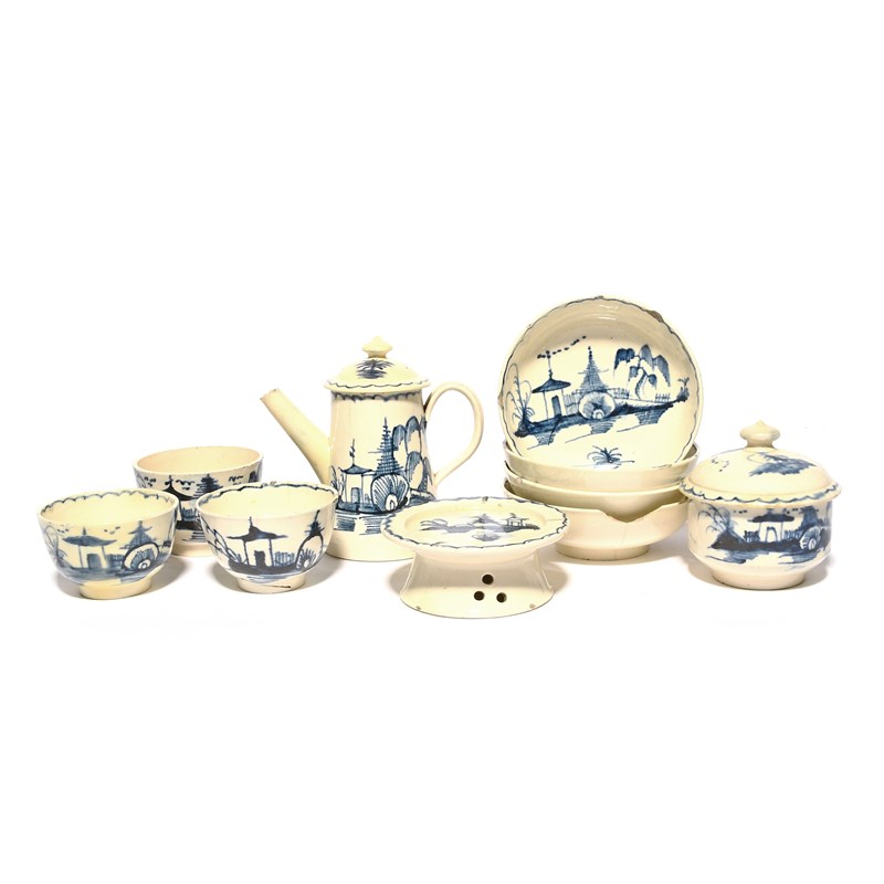 A miniature or toy creamware tea service, late 18th century, painted in blue with a pagoda landscape, some damages. Comprising: a coffee pot and cover, a sugar bowl and cover, a circular stand, three teabowls and four saucers. (12)