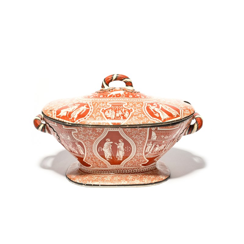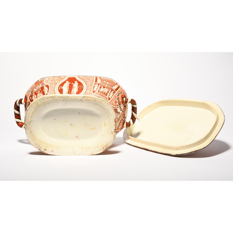 A Herculaneum creamware tureen and cover, 19th century, printed in red with Etruscan figures and