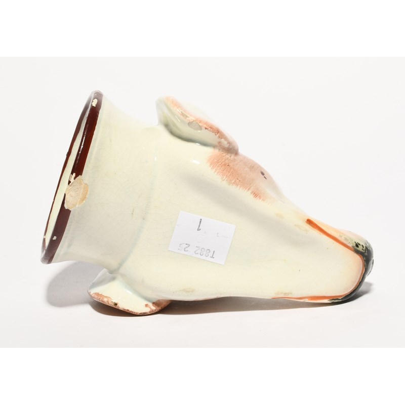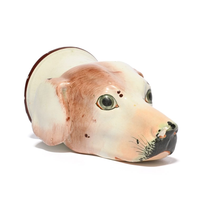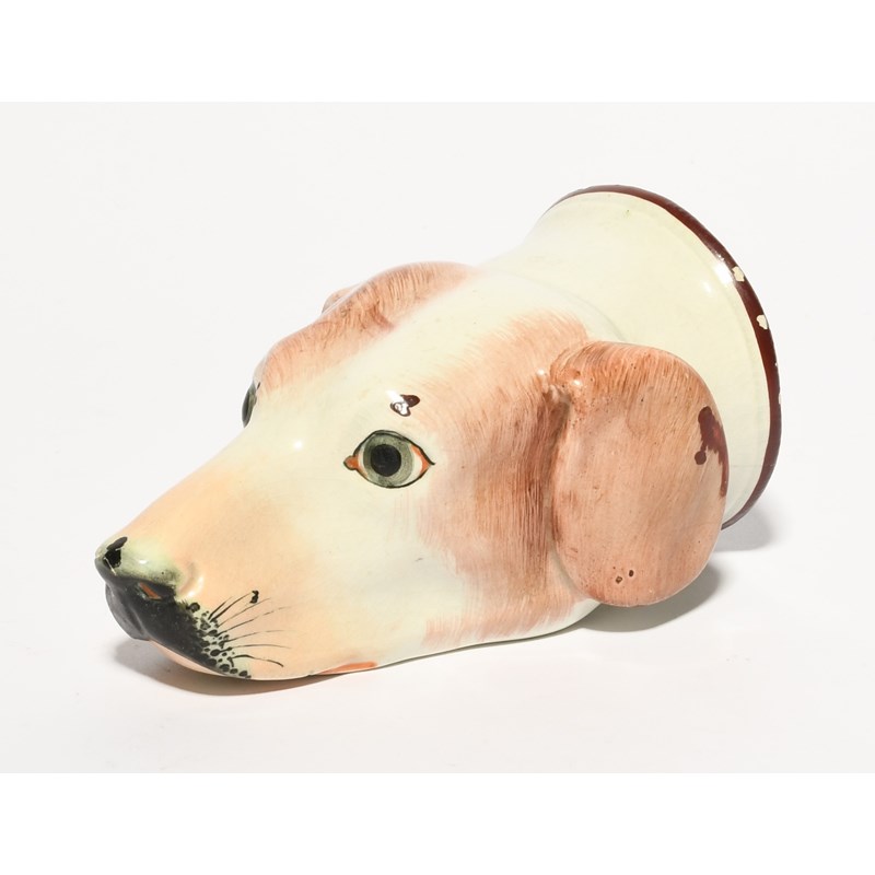 A pearlware stirrup cup, early 19th century, modelled as the head of a dog or hound, its coat