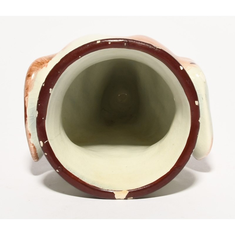 A pearlware stirrup cup, early 19th century, modelled as the head of a dog or hound, its coat detailed in brown patches, some glaze chipping, 13.5cm.