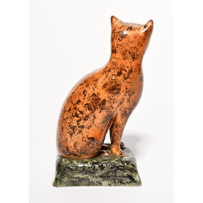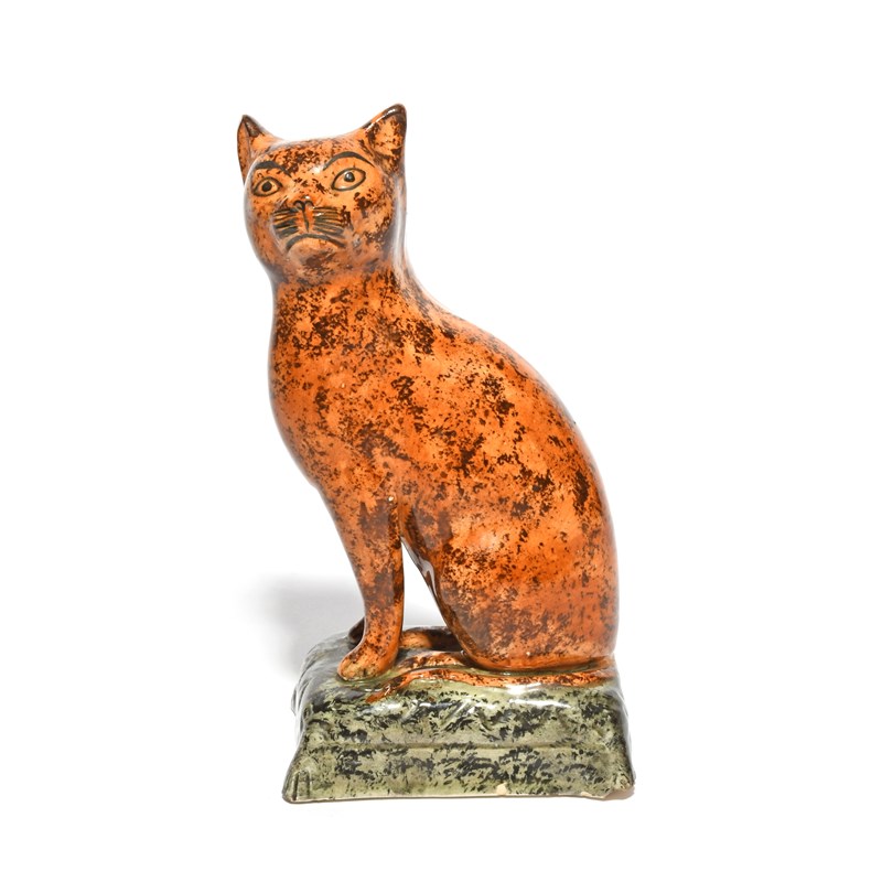 A rare pearlware figure of a cat, early 19th century, seated on its haunches with head turned to the left, its coat sponged with manganese over an orange glaze, raised on a grey patterned cushion, a chip to the base, 17.2cm.
