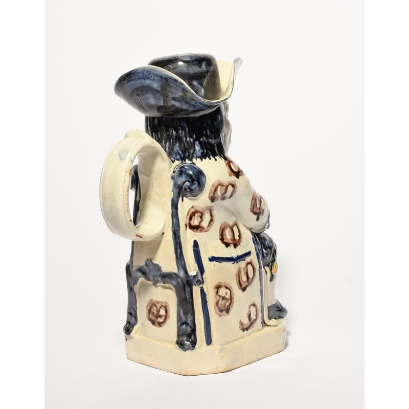 An Ordinary Toby jug and stopper, c.1800, seated with a foaming jug of ale and a long-stemmed pipe, his coat with unusual manganese motifs, , his hat, hair and breeches in an indigo blue, some restoration to the stopper, 24.5cm. (2)