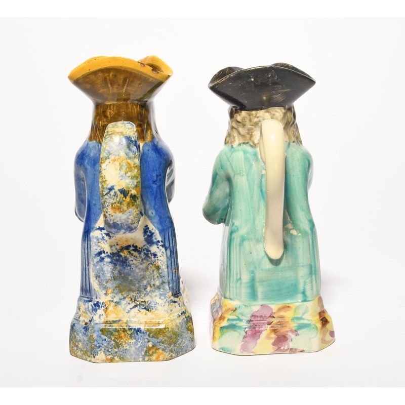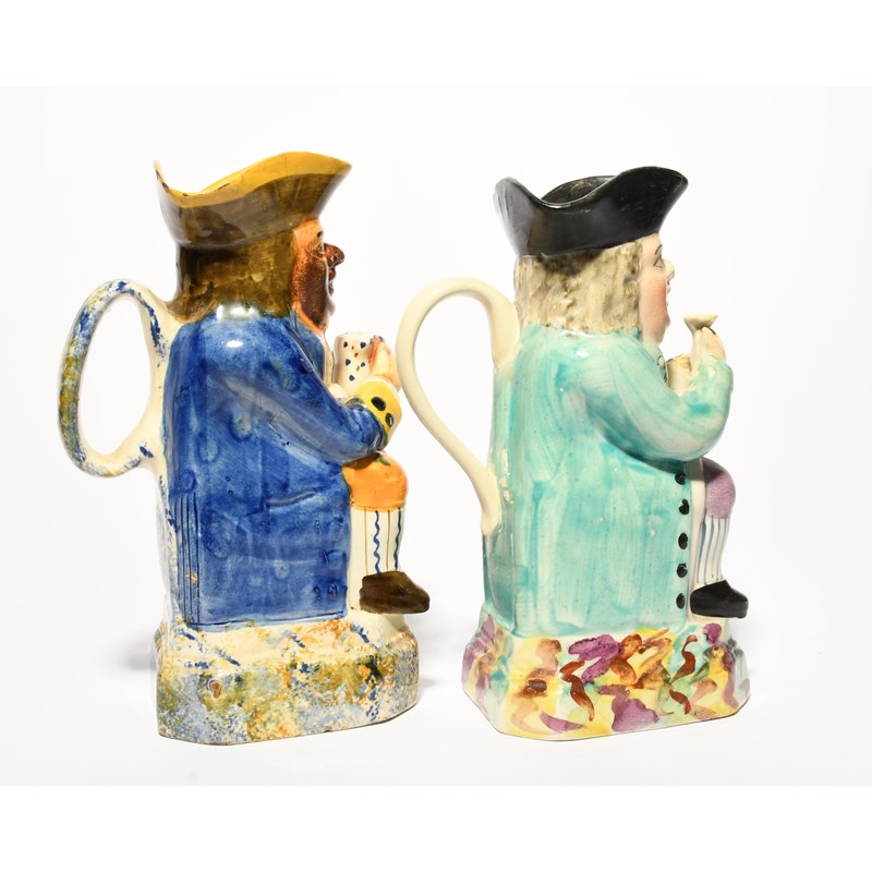 A small Pratt ware Toby jug, c.1800-10, seated on a tall base and holding a jug of ale decorated with polka dots, the base sponged in blue and ochre, and a second small Toby jug, wearing a turquoise coat over lilac breeches and holding a glass to his lips, the second toby's handle a replacement, 19cm max. (2)