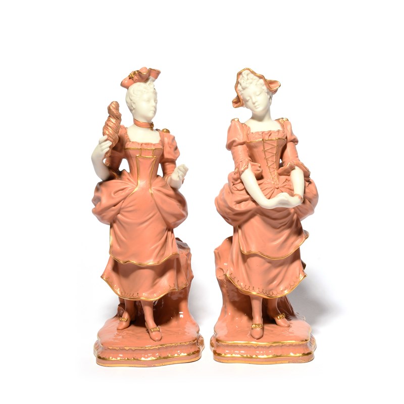 An unusual pair of Minton figures, c.1895-1900, of high society ladies wearing bustle dresses, decorated in a rich coral pink, their faces and arms left in the white, one with a gilt monogram for Marc-Louis Solon, gilt globe mark and indistinct swan date mark, 25.8cm max. (2)