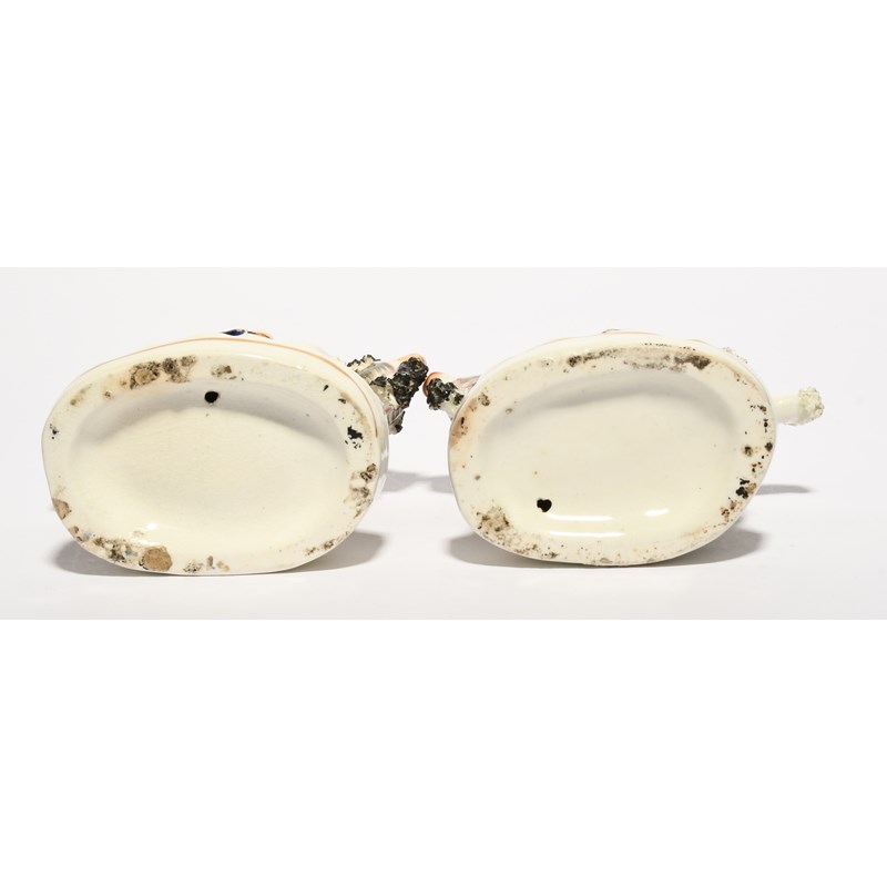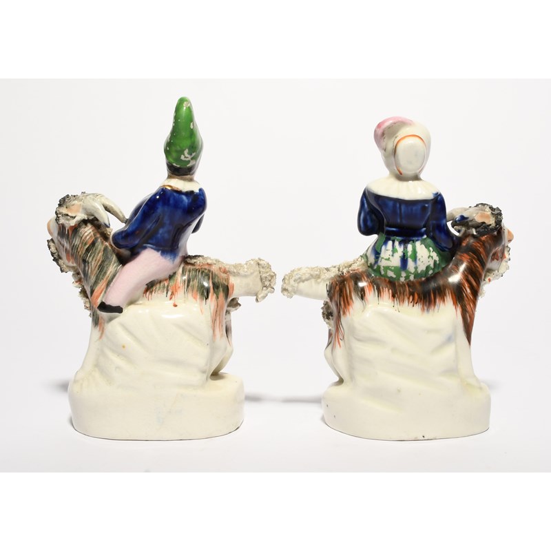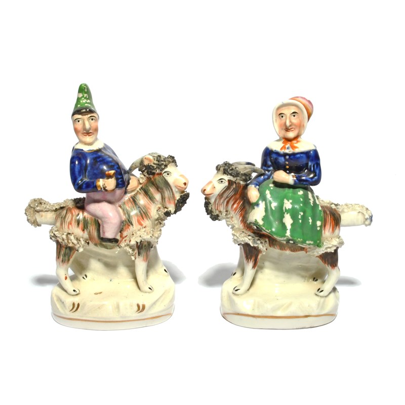 A pair of Staffordshire porcelain figures of Punch and Judy, 19th century, the grotesque couple riding on the back of goats, raised on oval bases with gilt detailing, a little flaking to the enamel, 17cm. (2)