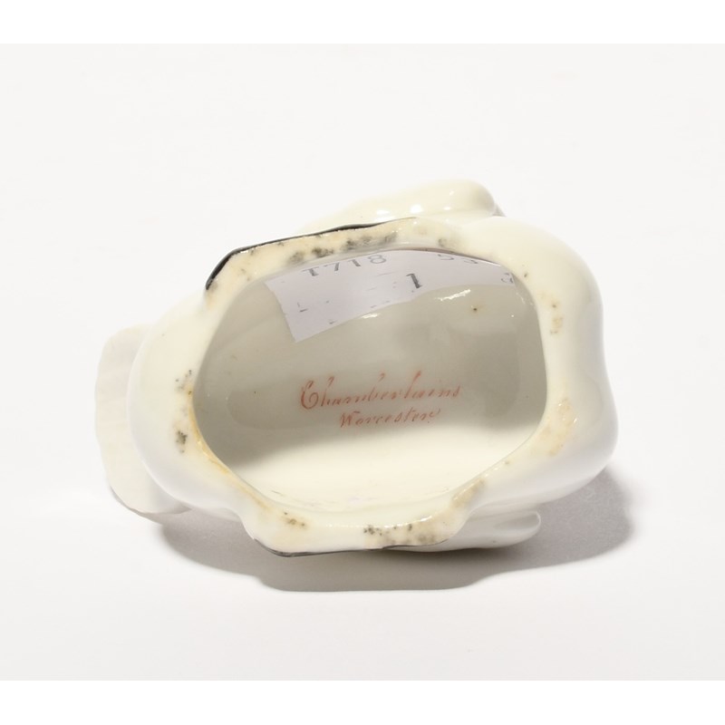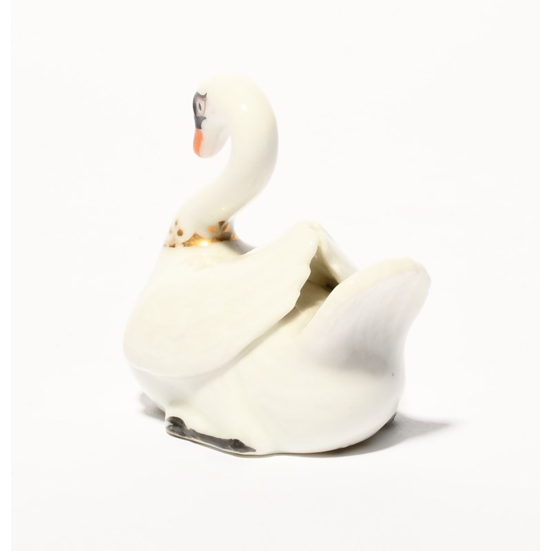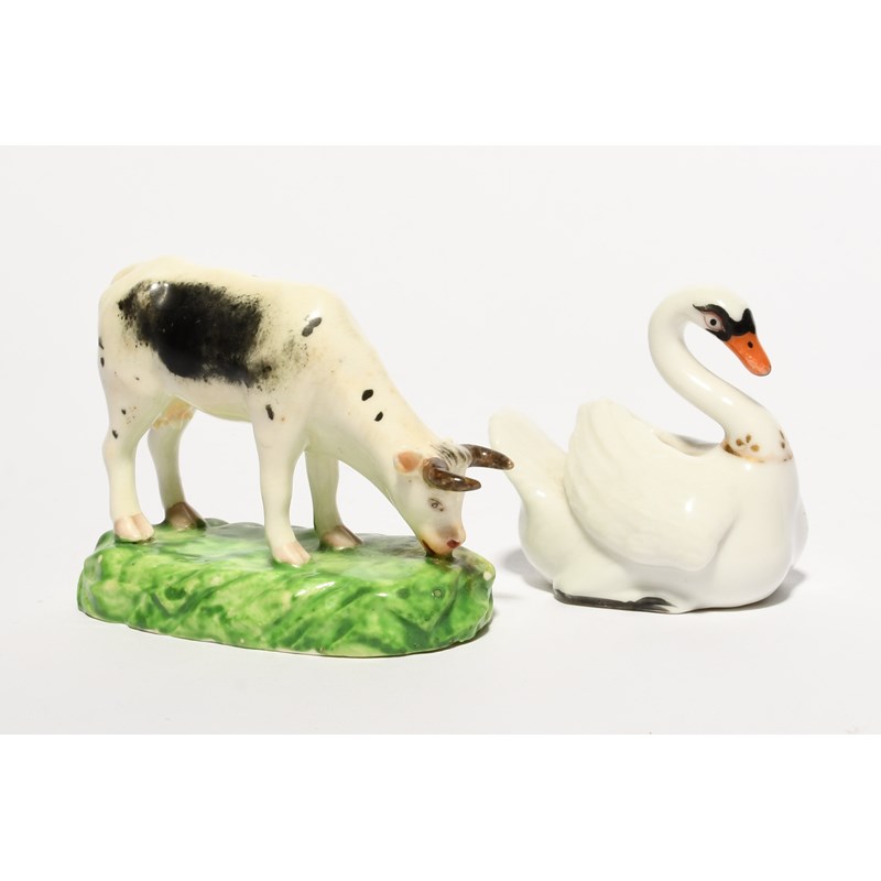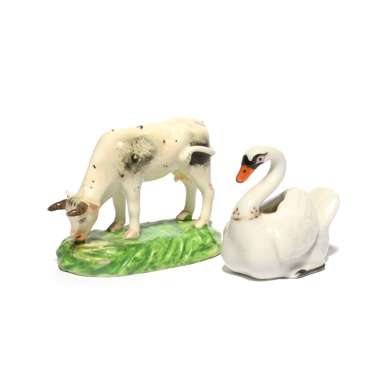 A Chamberlain's Worcester figure of a swan, c.1810, modelled with wings folded across its back, red script mark, and a small Derby model of a cow grazing, some good restoration to the cow's horns, 6cm high max. (2)