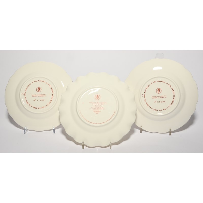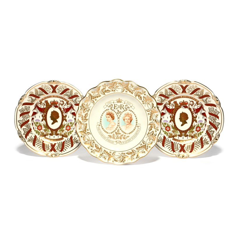 Three Royal Crown Derby commemorative plates, modern, two for the Ruby Jubilee of Queen Elizabeth II, numbers 38 and 123 of a limited edition of 500, and the other for her Diamond Jubilee, number 90 of a limited edition of 750, in their original boxes. (3)