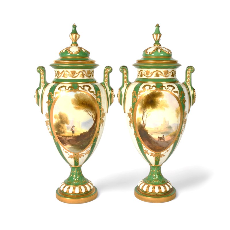 A pair of Royal Worcester vases and covers, date codes for 1912, of shape 2486, painted by Harry Davis with travellers in rural landscapes, beneath tall trees and before misty castle ruins, reserved within gilt panels on a green and white striped ground, signed, printed marks, some damages, 31cm. (4)