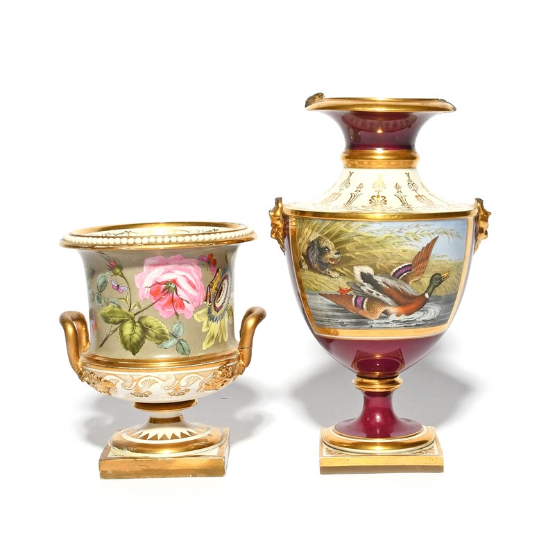 Two Flight Barr and Barr vases, c.1820-30, one well painted with a dog chasing a mallard duck onto