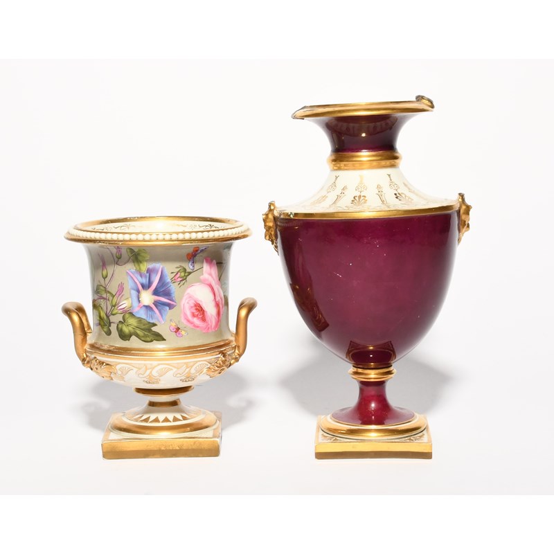 Two Flight Barr and Barr vases, c.1820-30, one well painted with a dog chasing a mallard duck onto the open water, reserved on a claret ground, the other with a continuous band of flowers including rose, convolvulus and passionflower, script marks, the handles restored or lacking, 22cm max. (2)