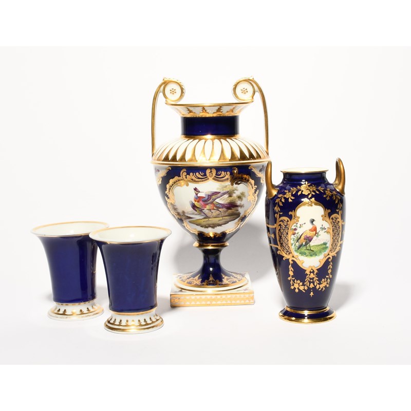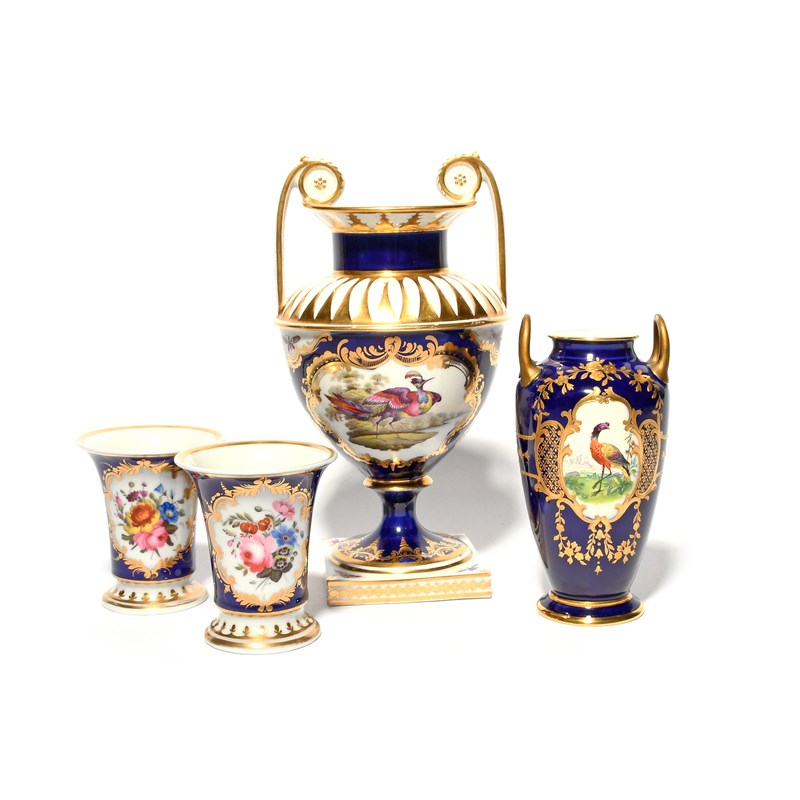 Four English porcelain vases, 19th century, a pair of Chamberlain's spill vases painted with flowers, a Minton two-handled vase painted with birds, and a larger two-handled vase painted with exotic birds, all reserved on a mazarine blue ground, restoration to the handles of the Minton vase, 23cm max. (4)