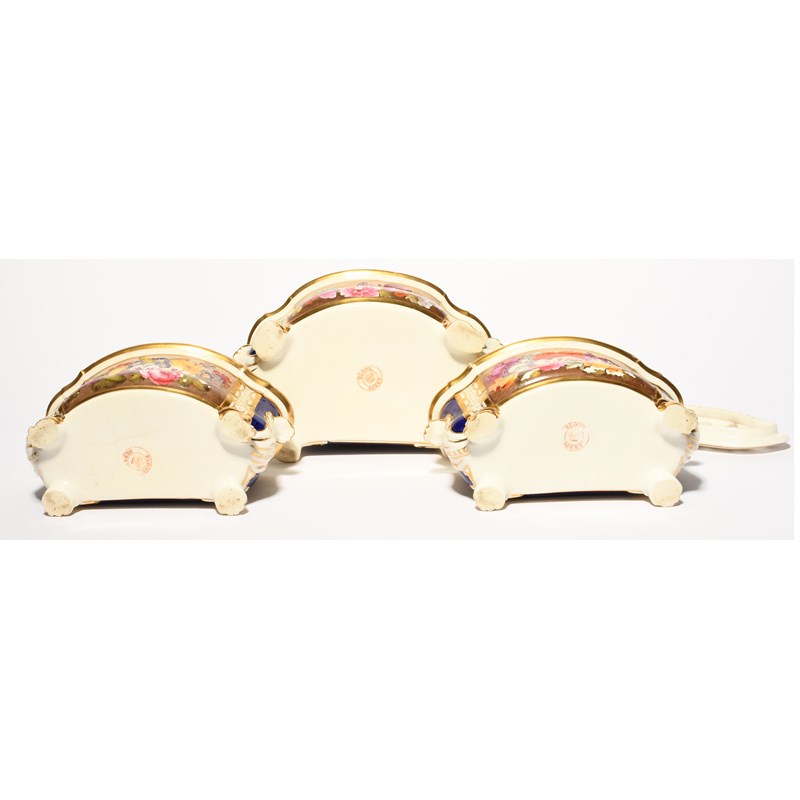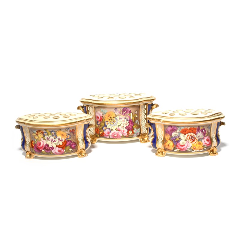 A garniture of three Bloor Derby bough pots and covers, c.1825-30, painted perhaps by Thomas Steel