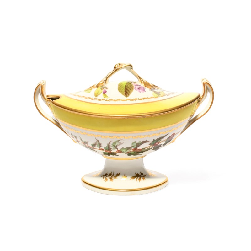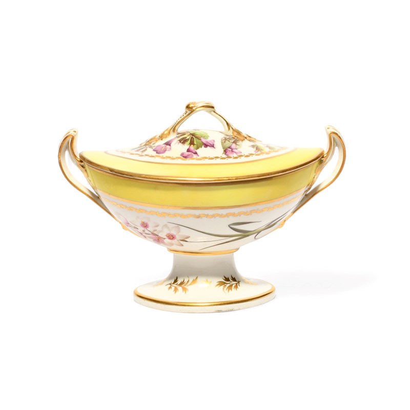 A Derby botanical sauce tureen and cover, c.1800, painted in pattern 216 with floral specimens of Blitum virgatum, Scilla campanulata and Melissa grandiflora, after prints by John Edwards, within rich yellow borders, titled in blue, restoration, 22cm across. (2)