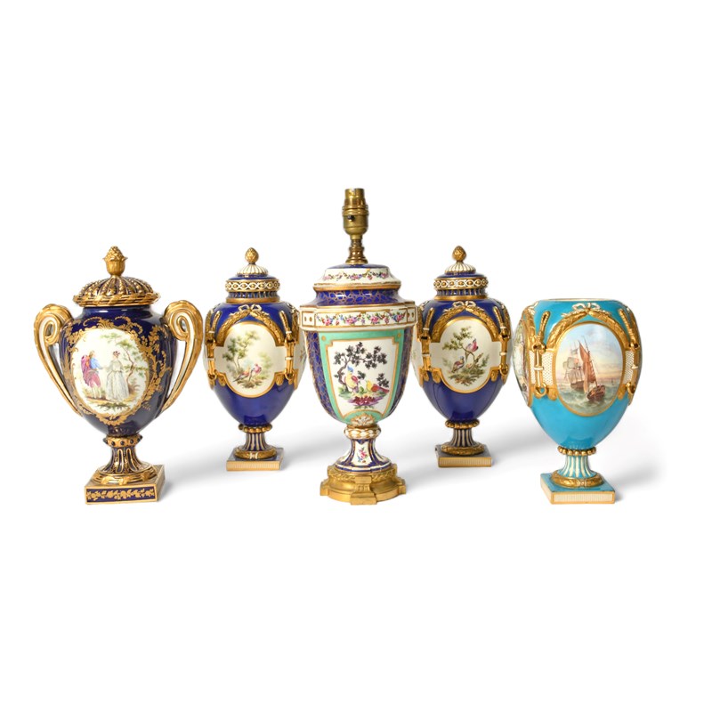 A pair of Minton porcelain vases and covers, 19th century, decorated in the Sèvres style with panels of birds and flowers on a blue ground, a Minton vase of the same shape painted with landscape panels and boats at sea, a two-handled vase and cover painted with a courting couple, and a lamped Sèvres-style vase and cover painted with birds on a blue caillouté ground, damages, 38cm max. (8)