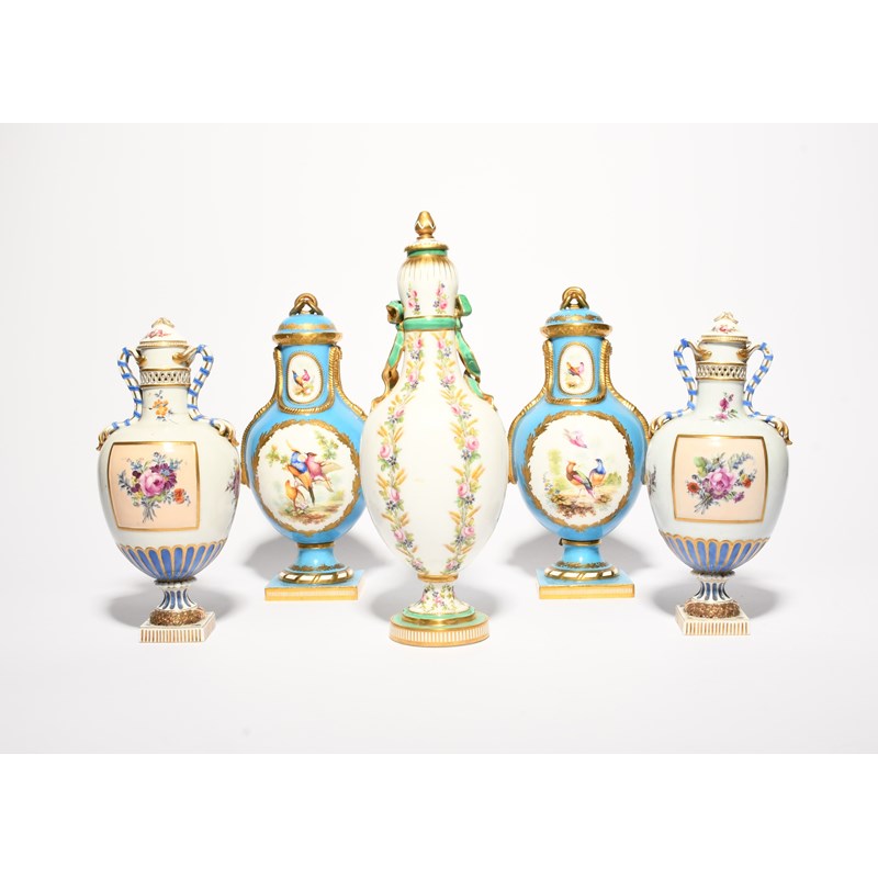 A pair of Coalport vases and covers, 19th century, in the Sèvres manner, painted with panels of exotic and aquatic birds within gilt panels on a turquoise ground, a pair of Continental porcelain vases and covers in the same shape, painted with panels of flowers, and a tall English porcelain vase and cover of hexafoil shape, painted with stripes of rose, cornflower and barley, the handles formed as ribbons, some damages and restoration, 31.5cm max. (10)