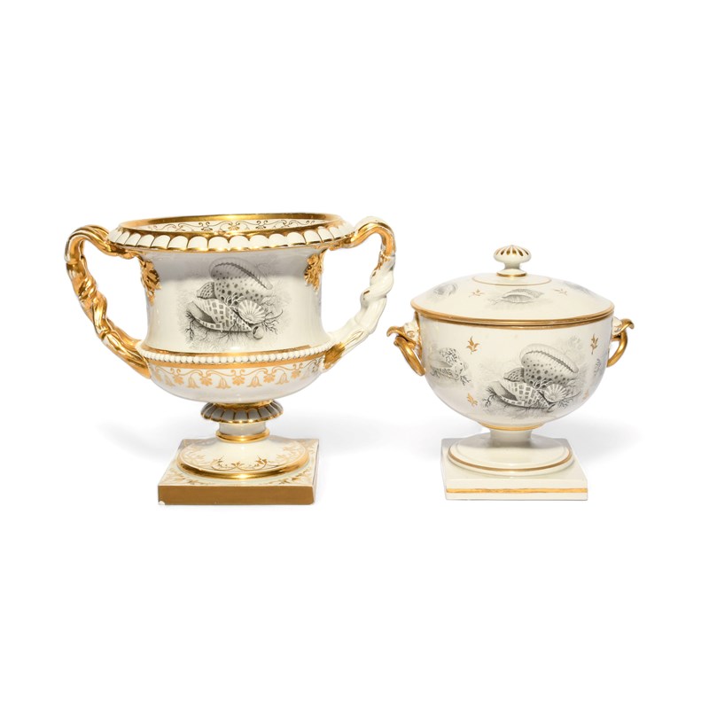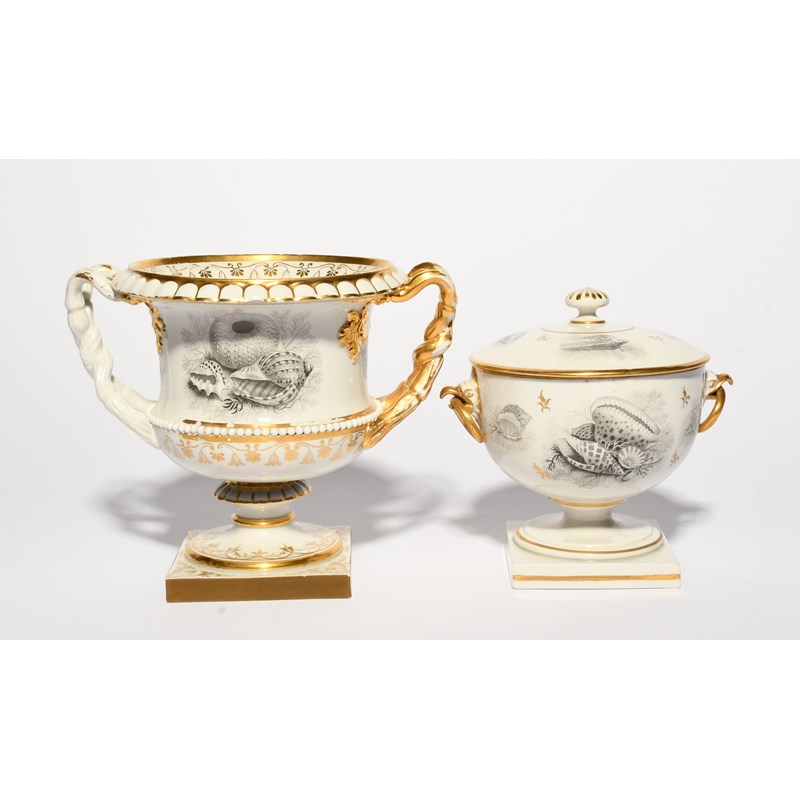A Barr Flight and Barr vase and a jar and cover, c.1810-15, bat printed in black with arrangements of sea shells, urchins and coral on a seaweed ground, the jar with ring handles issuing from eagle heads, the vase of campana shape, some gilt wear, 16.7cm max. (3)