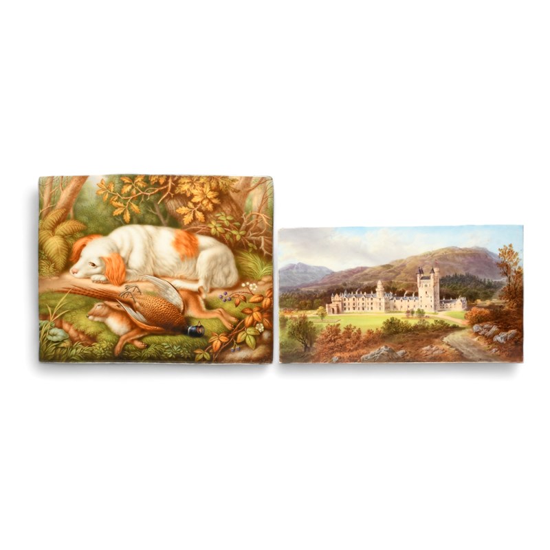 Two English porcelain rectangular plaques, 19th century, one painted by Evans with a view of Balmoral Castle, the other with a dog recumbent beside game in a woodland, dated 1874, 20.2cm max. (2)