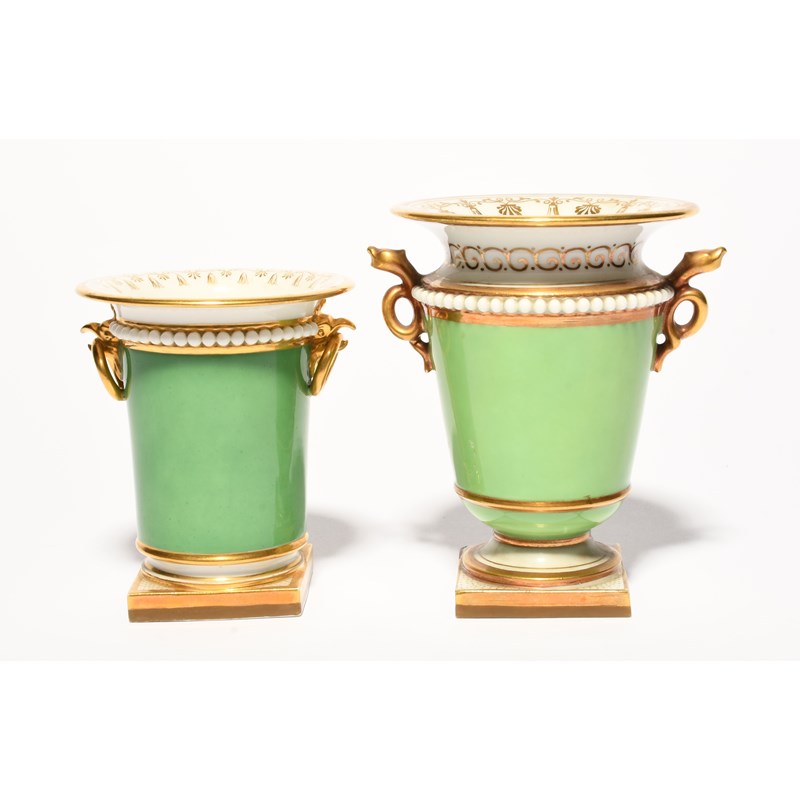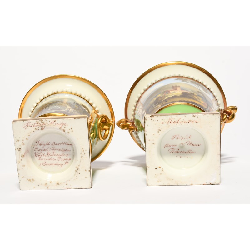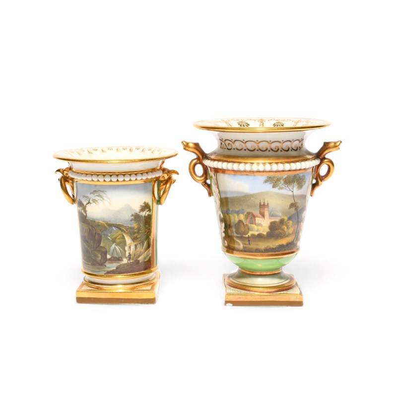 Two small Flight, Barr and Barr vases, c.1815, the smaller painted with a figure standing beside a tall arched bridge with mountains in the distance, the larger with a view of Great Malvern Priory, reserved on green grounds beneath beaded borders, puce script marks, a small repair to one handle, 10.8cm max. (2)