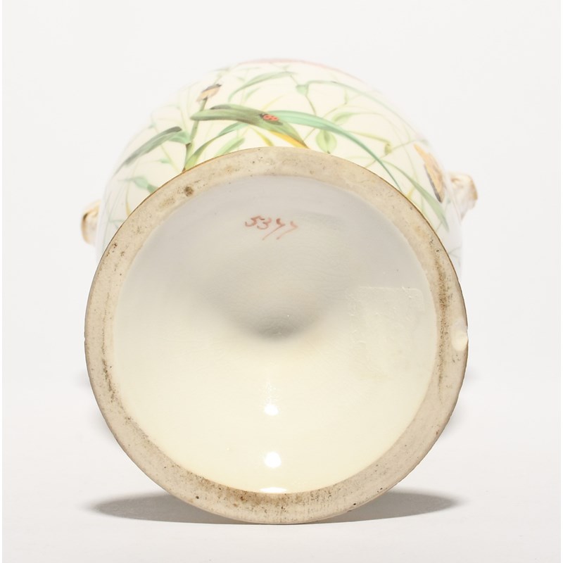 A fine Staffordshire porcelain vase, 1st half 19th century, well painted with butterflies, damselflies, ladybirds and other insects on and around summer grasses, reserved on a white ground, the neck with a gilt foliate border, pattern number 5377 in red, 26cm.